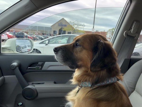 Unamused pooch waiting impatiently for the human to finish getting groceries.